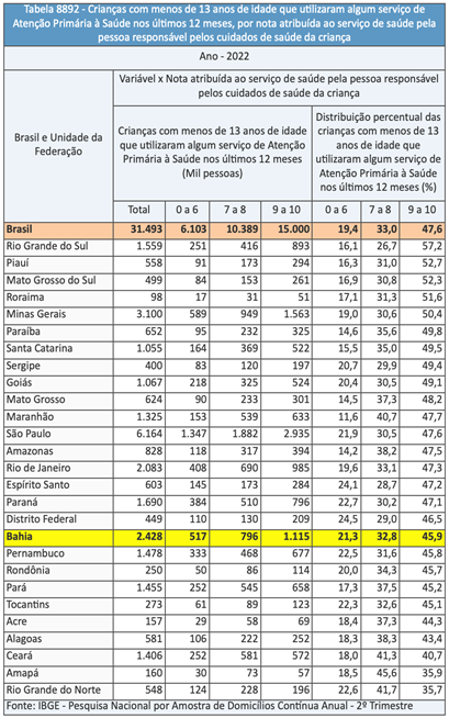 Dados do Instituto Brasileiro de Geografia e Estatística (IBGE), divulgados nesta quarta-feira (21), mostram que, entre 2021 e 2022, 1 a cada 5 responsáveis por crianças atendidas em postos de saúde da Bahia ficaram insatisfeitos com o serviço. No período, cerca de 2,4 milhões de crianças de até 13 anos utilizaram algum serviço de Atenção Primária à Saúde no estado.