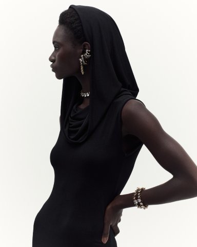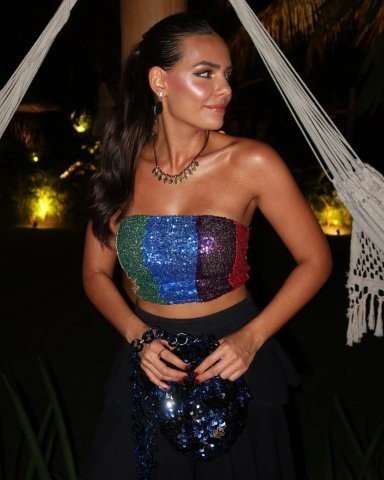 Sob as luzes do palco, o brilho ganha ainda mais força e transforma qualquer produção em protagonista. Ele aparece em paetês, franjas cintilantes e aplicações estratégicas que criam movimento e impacto visual, seja em uma peça statement ou em composições cheias de personalidade. A proposta é construir o visual a partir desse ponto de destaque, deixando que o efeito luminoso conduza a estética.