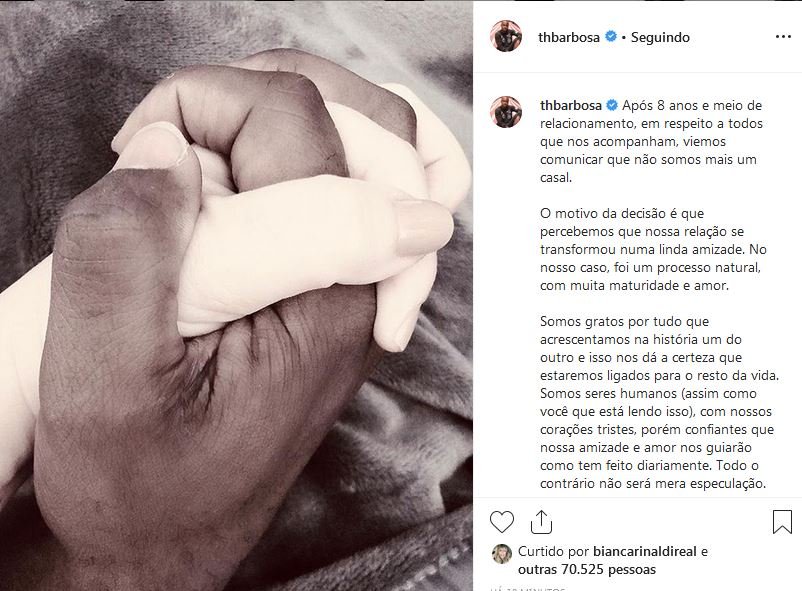 “Somos seres humanos (assim como você que está lendo isso), com nossos corações tristes, porém confiantes que nossa amizade e amor nos guiarão como tem feito diariamente. Todo o contrário não será mera especulação. Nosso casamento termina em paz. Não estranhem se nos encontrarem um na companhia do outro daqui pra frente”, completou a eterna Mille de Chiquititas. Thiaguinho publicou o mesmo texto, além da mesma imagem em que mostra a mão dos dois com suas alianças de casamento. Os comentários das publicações foram trancados.