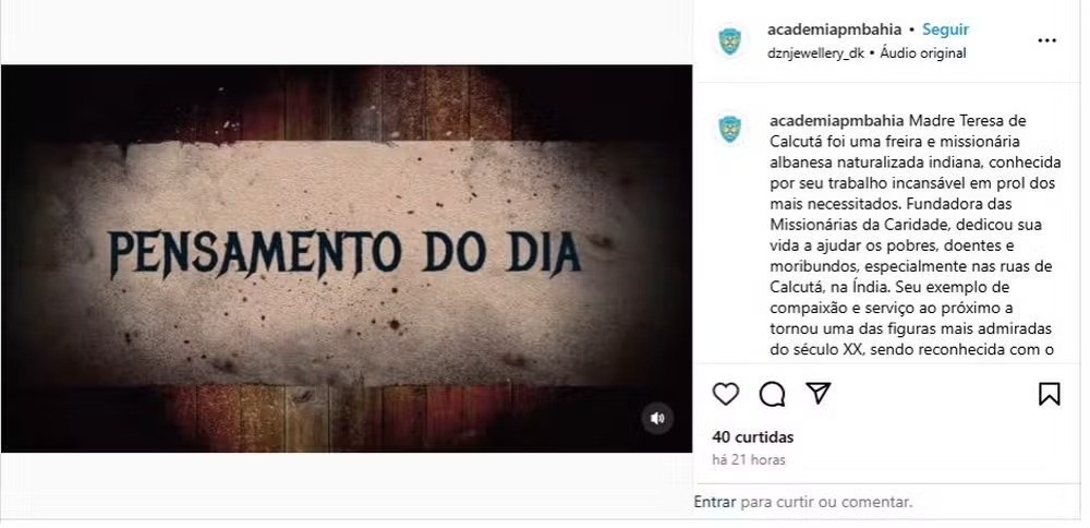 Diante da repercussão negativa, a publicação foi apagada e substituída por uma frase de Madre Teresa de Calcutá. Em nota, a Polícia Militar da Bahia informou que repudia o conteúdo “indevidamente publicado” e que adotou as providências administrativas cabíveis.