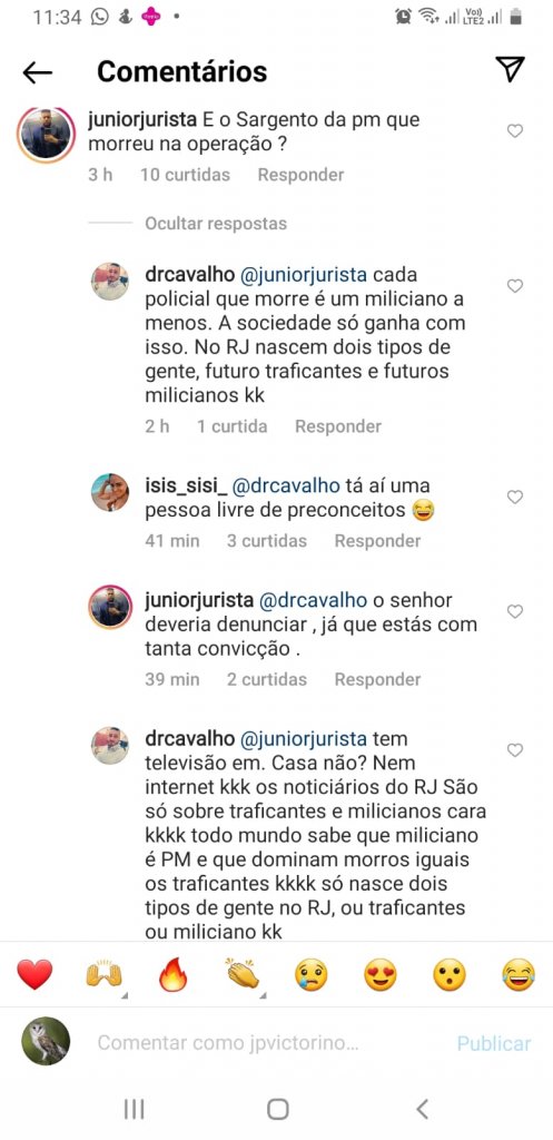 Em comentário no Instagram, advogado afirma que “cada policial que morre é um miliciano a menos”. Ele se refere a morte de um sargento da Polícia Militar, no Complexo do Salgueiro, na manhã de sábado (20).