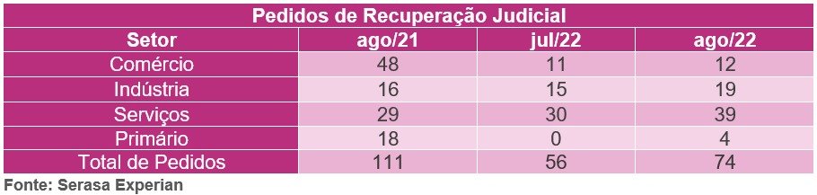 De acordo com os dados do Indicador de Falências e Recuperação Judicial da Serasa Experian, em agosto foi registrada uma queda de 33,3% nas solicitações de recuperação judicial: foram feitos 74 pedidos frente os 111 realizadas no mesmo mês do ano anterior. As micro e pequenas empresas foram as que mais solicitaram pelo recurso, com 51 pedidos. Ainda assim, as empresas de menor porte tiveram melhora na análise anual, já que em agosto de 2021 marcaram 81 requisições. Os negócios de grande porte foram os únicos a revelar alta no ano a ano.