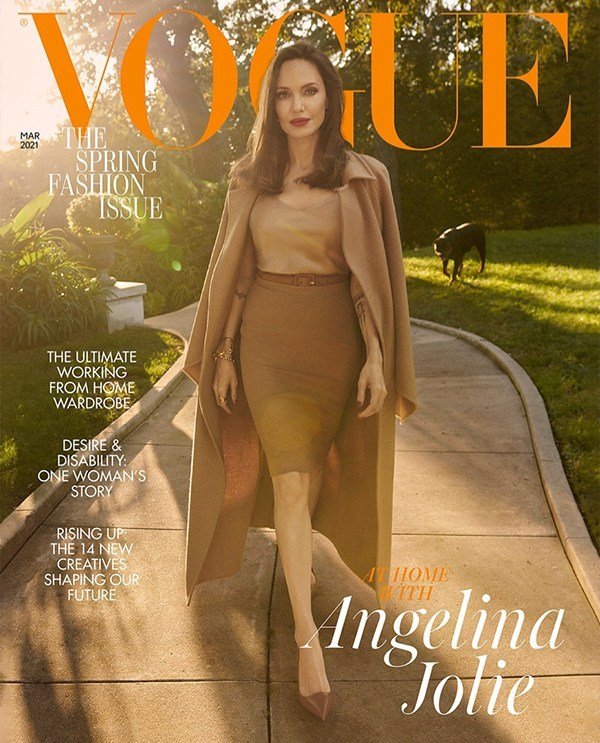 A ‘Vogue’ britânica convidou Angelina Jolie para estrelar a edição março 2021. Fotografada por Craig McDean, a atriz estampa duas capas da publicação. Na primeira ela veste um look em tons neutros, composto por casaco e saia lápis da Max Mara, blusa Sablyn e scarpins Ralph Lauren. Na segunda, Jolie aparece em um look total black com blusa de gola alta Burberry, calça Max Mara e sapatos Chanel. Todo o ensaio fotográfico aconteceu em locações dentro da casa da atriz em Los Angeles, inclusive seus cachorros Dusty e Sophia aparecem em uma foto.