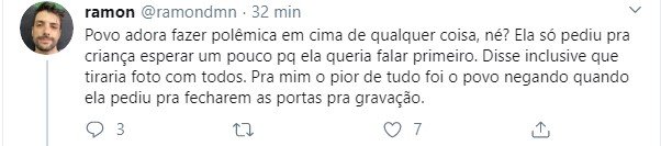 Após a acusação, internautas fãs de Anitta saíram em defesa dela. “Eu não vi empurrão. E achei ela até mais educada que o normal”, disse um. Outro escreveu no Twitter: “Povo adora fazer polêmica em cima de qualquer coisa, né? Ela só pediu para a criança esperar um pouco porque ela queria falar primeiro. Disse, inclusive, que tiraria foto com todos”.