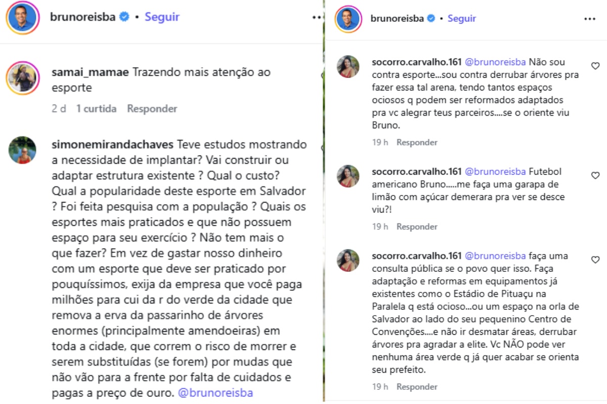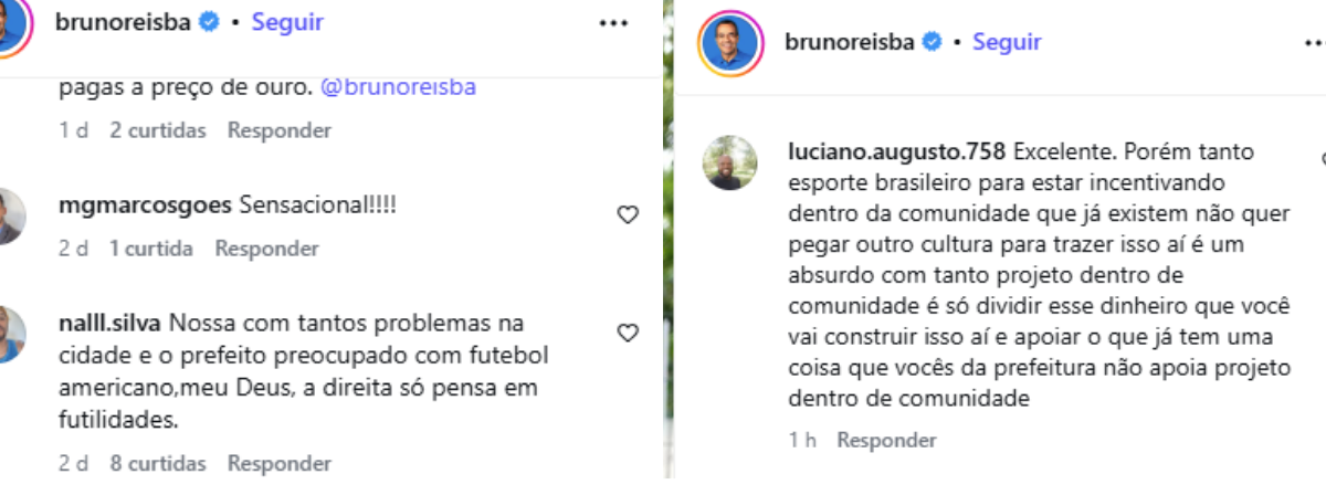 Na publicação que anuncia a construção da arena no perfil do prefeito há comentários que fazem os mesmos questionamentos. "Nossa com tantos problemas na cidade e o prefeito preocupado com futebol americano. Meu Deus, a direita só pensa em futilidade", escreveu um usuário.