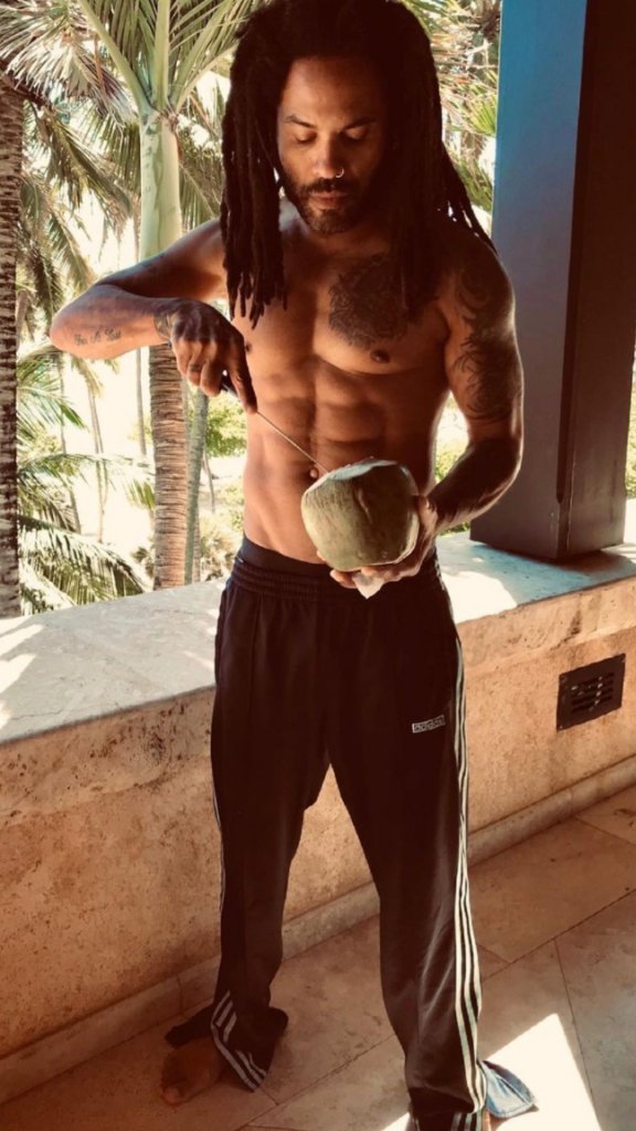 Ontem, o cantor Lenny Kravitz publicou uma foto no Instagram em que aparece abrindo com coco. O que chamou a atenção dos seguidores foi a boa forma e o tanquinho do artista que está com 56 anos. “1:23 PM”, escreveu ele na legenda. Ele é conhecido pelos hits “It Ain’t Over ’til It’s Over” e “I Belong to You”. Quem fez o registro de Lenny abrindo o coco foi Karen Gault.