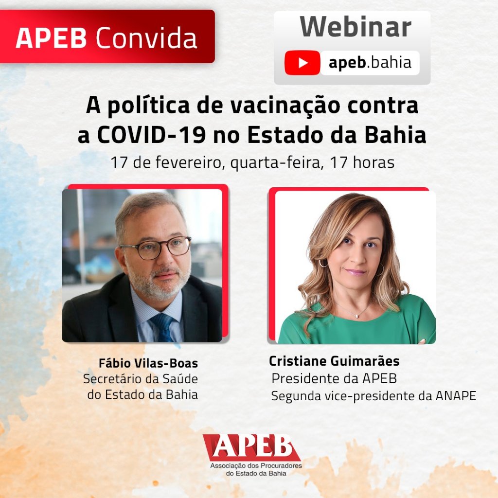 Com transmissão pelo seu canal oficial no YouTube (apebba), a Associação dos Procuradores do Estado da Bahia (APEB) realiza nesta quarta-feira, 17 de fevereiro, às 17 horas, um webinar sobre a política de vacinação contra a Covid-19 em nosso estado. O convidado especial é o cardiologista Fábio Vilas-Boas Pinto, Secretário da Saúde do Estado da Bahia, que será recebido pela procuradora Cristiane Guimarães, presidente da APEB e segunda vice-presidente da ANAPE.