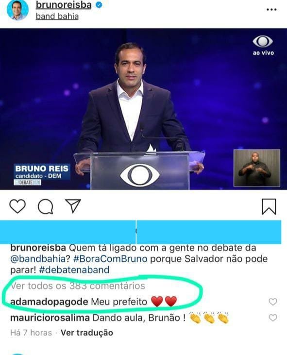 Após uma polêmica, a cantora Dama do Pagode apagou um comentário que deixou em uma publicação no Instagram do candidato Bruno Reis (DEM), que concorre à prefeitura de Salvador. A cantora é uma das intérpretes do jingle de campanha da candidata Major Denice Santiago (PT), que é opositora do democrata. No comentário, ela havia manifestado apoio ao vice-prefeito da capital baiana: "Meu prefeito". Após a repercussão, ela apagou o comentário. Porém, Mas a postagem acabou viralizando na internet.