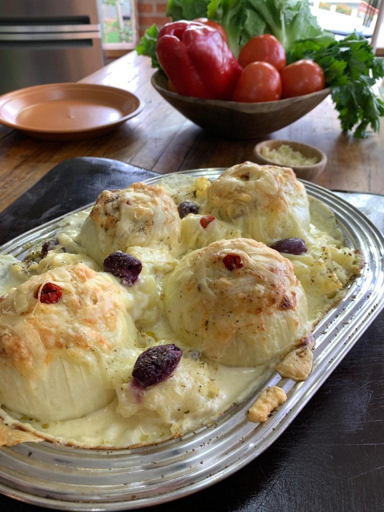 - Rechear as cebolas com esse purê, intercalando com catupiry. Ao final, colocar mussarela e gratinar.  foto Churrasqueadas..jpg)