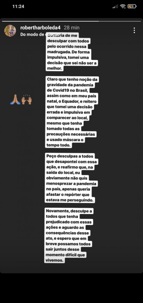 "Claro que tenho noção da gravidade da pandemia de Covid-19 no Brasil, assim como em meu país natal, o Equador, e reitero que tomei uma decisão errada e impulsiva em comparecer ao local, mesmo que tenha tomado todas as precauções necessárias e usado máscara o tempo todo", escreveu.