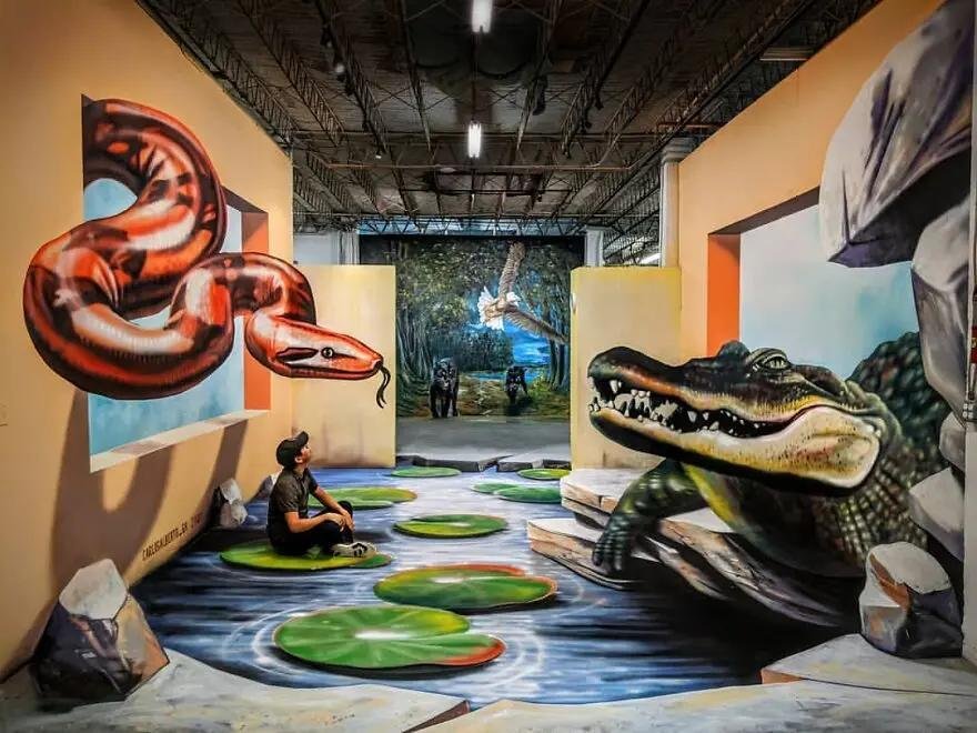 As pinturas geram uma experiência incrível para quem visita suas cenas surreais, já que o artista brinca com as sombras e com a perspectiva, dando maravilhosas ilusões de ótica em 3D.