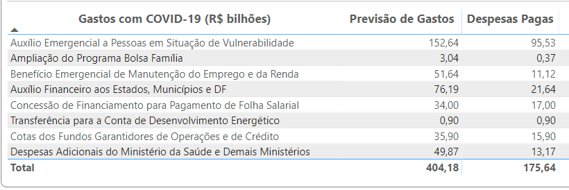 Dentre os gastos fixos, o auxílio emergencial de R$ 600 para os trabalhadores informais e famílias de renda baixa lidera a posição. Estão previstos R$ 152,6 bilhões para as três parcelas, dos quais R$ 95,53 bilhões já foram pagos. O governo confirmou o pagamento de mais duas parcelas, mas ainda não confirmou qual vai ser o valor.