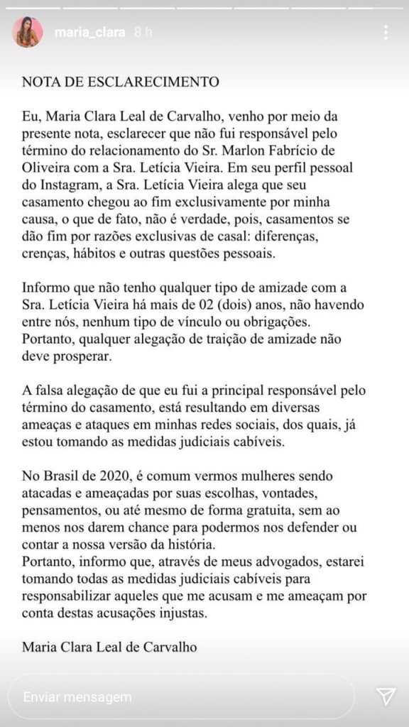 Ontem, Maria Clara Leal, acusada por Letícia Oliveira de ser amante do sertanejo Marlon e pivô do término do casal, se pronunciou em suas redes sociais e negou que tenha sido a responsável pelo término. “A sra. Letícia Vieira alega que seu casamento chegou ao fim exclusivamente por minha causa, o que de fato, não é verdade, pois, casamentos se dão fim por razões exclusivas de casal: diferenças, crenças, hábitos e outras questões pessoais”, disse. Em sua nota de esclarecimento, que pode ser lida na íntegra no final deste texto, Maria Clara negou ser amiga de Letícia. “Informo que não tenho qualquer tipo de amizade com a Sra. Letícia Vieira há mais de 02 (dois) anos, não havendo entre nós nenhum tipo de vínculo ou obrigações”, diz.