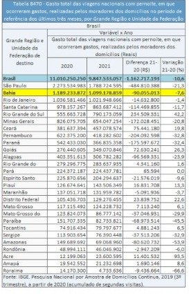 No entanto, o valor total despendido por turistas brasileiros na Bahia caiu 7,6% de 2020 para 2021. O número é equivalente a uma perda de R$ 90,1 milhões em um ano, segundo o levantamento. No Brasil, entre 2020 e 2021, a receita com turismo doméstico recuou 10,6% ou de R$ 1,162 bilhão em um ano. Roraima (-66,6%) teve a maior queda em termos percentuais, enquanto em valores o maior foi em São Paulo (menos R$ 484,8 milhões).
