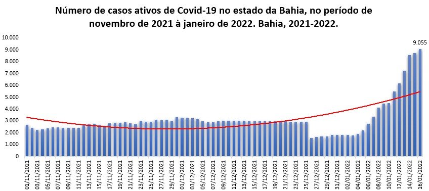 A Bahia registrou neste domingo (16) 9.055 casos ativos de Covid-19. A última vez que o estado teve um número de ativos maior ao de hoje foi em 23/07/21, quando foram registrados 9.301 ocorrências. O boletim epidemiológico aponta ainda que, nas últimas 24 horas, foram computados 1.472 casos de Covid-19 (taxa de crescimento de +0,11%), 1.145 recuperados e 4 óbitos. Dos 1.288.556 casos confirmados desde o início da pandemia, 1.251.839 já são considerados recuperados e 27.662 tiveram óbito confirmado.