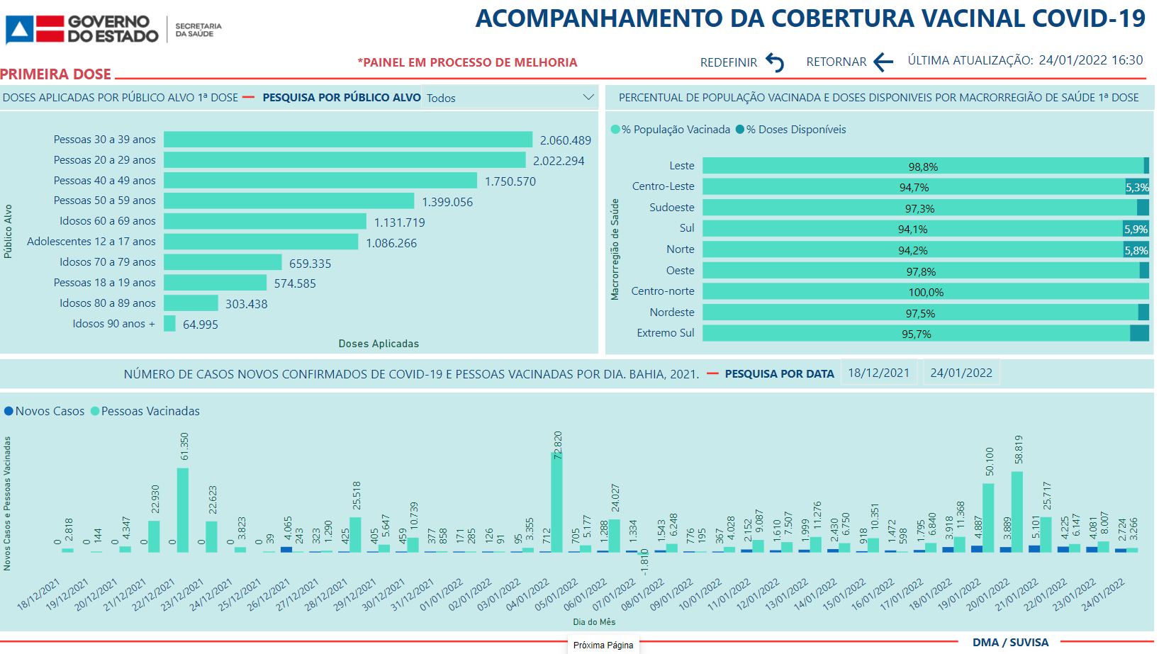 A Bahia vacinou mais 43 mil pessoas contra a Covid-19 nessa segunda-feira (24). Os dados são referentes a primeira dose. Com isso, o Estado já chega a 11.052.747 imunizados. Além disso, são 9.320.904 com a segunda dose e 2.080.641 com a dose de reforço. Do público de 5 a 11 anos, 24.436 crianças já foram imunizadas.