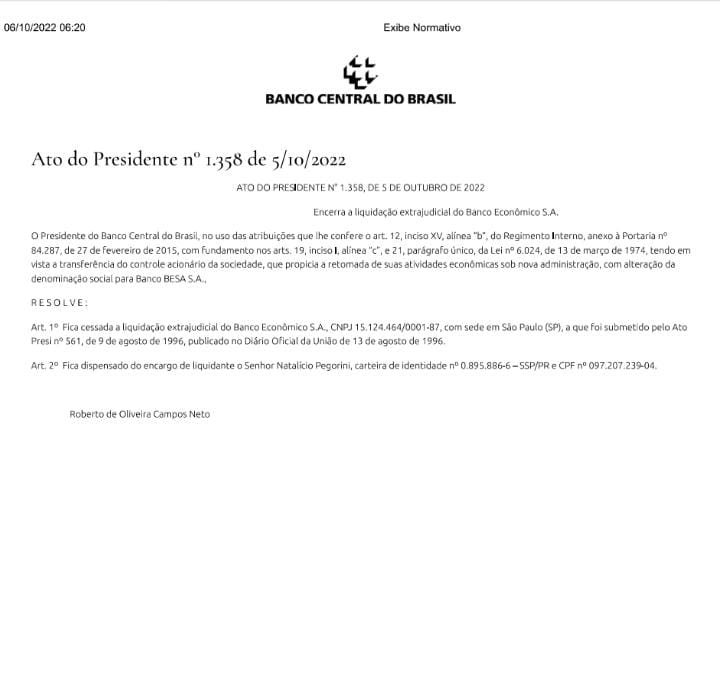 "O Presidente do Banco Central do Brasil, no uso das atribuições que lhe confere o art. 12, inciso XV, alínea "b", do Regimento Interno, anexo a Portaria n° 84.287, de 27 de fevereiro de 2015, com fundamento nos art. 19, inciso I, alínea "c", e 21, parágrafo único, da Lei n° 6.024, de 13 de março de J 974, tendo em vista a transparência do controle acionário da sociedade, que propicia a retomada de suas atividades econômicas sob nova administração com alteração da denominação social para Banco BESA S.A.,