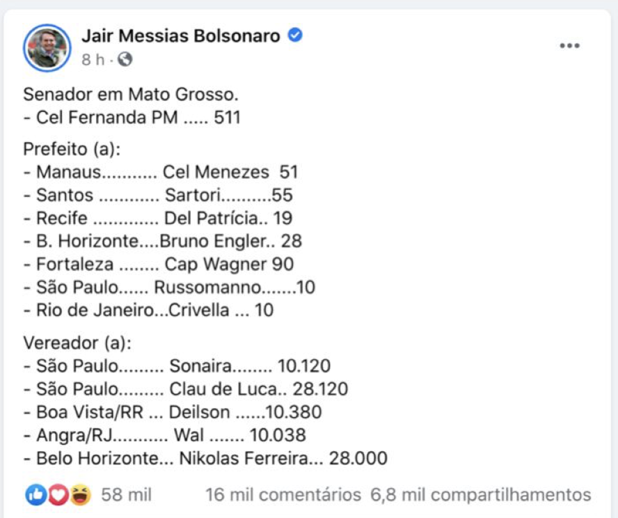 A seguir, os candidatos a vereador indicados pelo presidente na postagem: