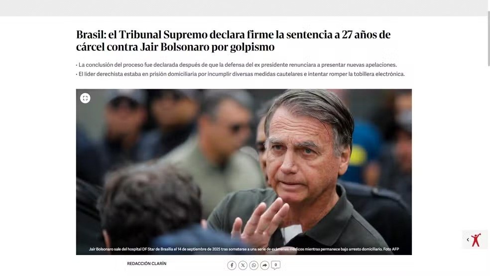 •Clarín: o jornal argentino destacou que a decisão de Moraes veio poucos dias após Bolsonaro ser preso preventivamente por tentar violar a tornozeleira eletrônica.