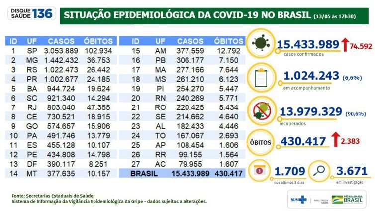 Segundo dados do Ministério da Saúde, também em 24h, mais 74.592 casos foram confirmados, totalizando 15.433.989 infectados.