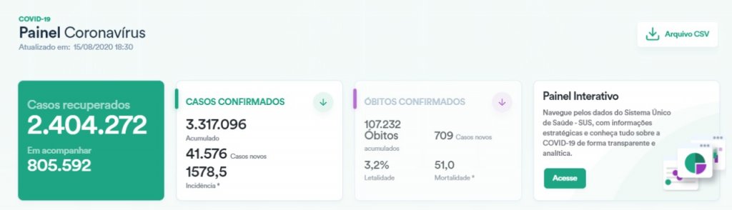 De acordo com o último boletim epidemiológico divulgado pelo Ministério da Saúde neste sábado (15), o Brasil registrou 709 novas mortes nas últimas nas últimas 24h por Covid-19. No total, são 107.232 óbitos registrados desde o início da pandemia. De ontem (14) para este sábado, o Ministério contabilizou 41.576 novos casos, totalizando 3.317.096 de pessoas confirmadas com a doença no Brasil.