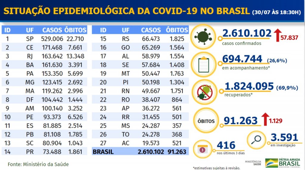 Segundo os dados do último boletim epidemiológico divulgada pelo Ministério da Saúde nesta quinta-feira (30), o Brasil registrou 1.129 novas mortes e 57.837 novos casos da Covid-19, doença causada pelo novo coronavírus. No total, o país soma 2.610.102 casos e 91.263 vítimas fatais da doença. Segundo a pasta, 70% das pessoas infectadas pela Covid-19 já se recuperaram, o que representa em torno de 1,82 milhão de brasileiros.