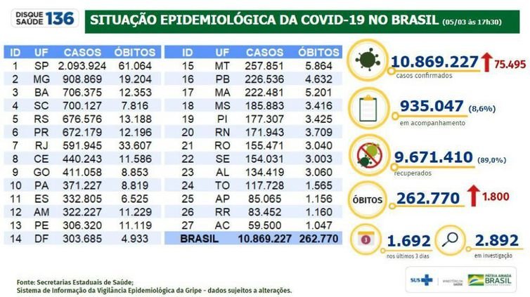 Com os diagnósticos positivos registrados na atualização, a soma de pessoas infectadas desde o início da pandemia alcançou 10.869.227.