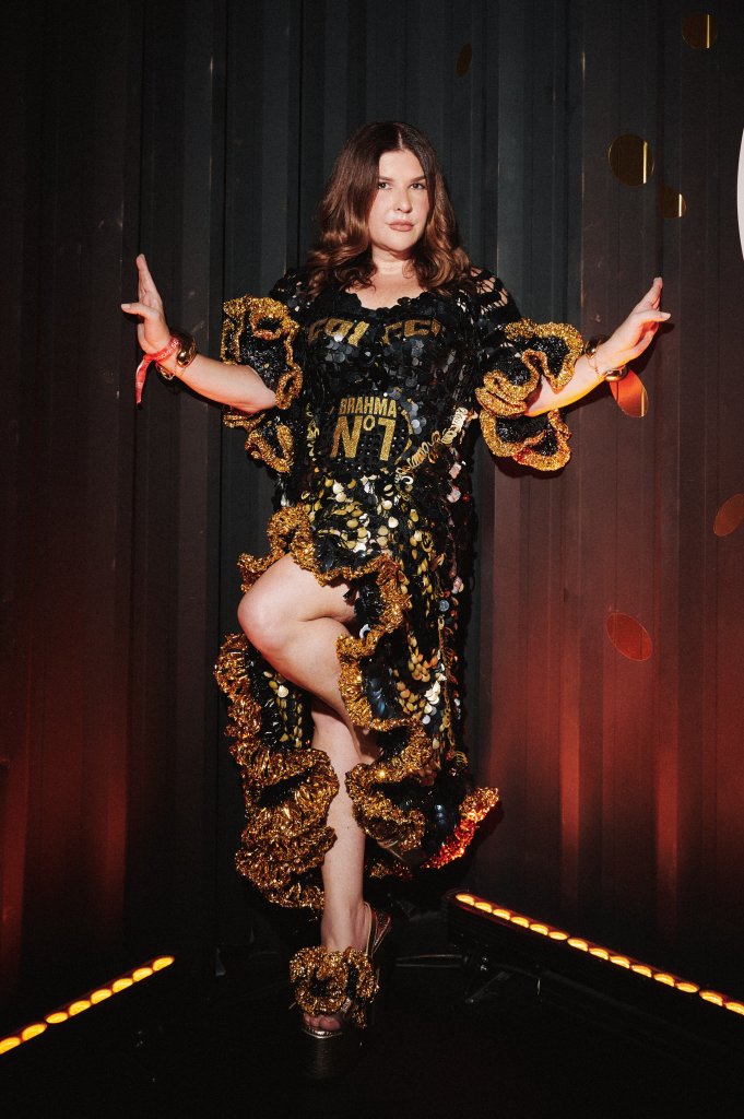 Para o segundo dia de Carnaval no Rio de Janeiro, Ju Ferraz transformou o camarote em extensão da passarela ao surgir com uma criação exclusiva de Gustavo Silvestre que traduz, em cada centímetro, a potência do trabalho manual brasileiro. O vestido, construído a partir da pesquisa do designer em crochê e superfícies têxteis artesanais, ganha leitura noturna e dramática em preto absoluto, iluminado por aplicações de paetês bordados à mão que desenham grafismos e revelam textura e profundidade.