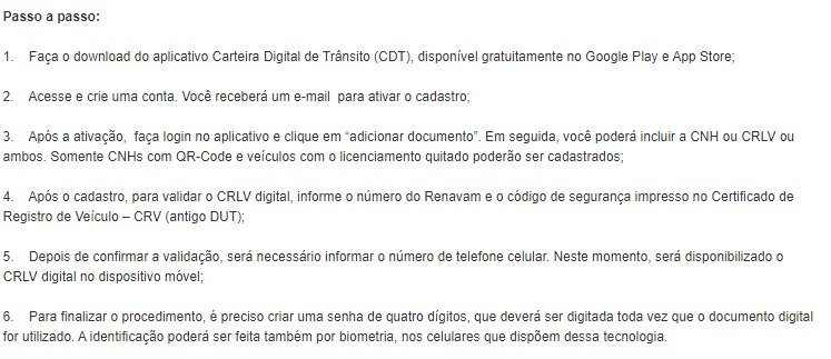 Para obter o serviço digital, a pessoa deve baixar o aplicativo no celular e cadastrar os documentos na plataforma, o que permitirá ao usuário visualizá-los sem a necessidade de acesso à internet. Somente veículos com o licenciamento em dia e carteiras que possuem o código bidimensional (QR-Code) poderão ser cadastrados.