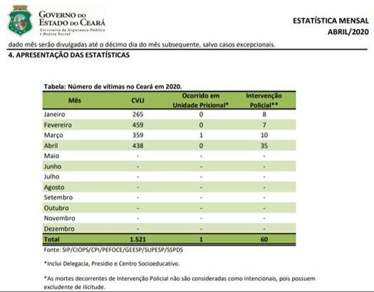 O Estado do Ceará apresentou um aumento de 90% no número de Crimes Violentos Letais Intencionais (CVLI) - índice que engloba homicídios, feminicídios, latrocínios e lesões corporais seguidas de morte - nos 22 primeiros dias de abril, conforme dados mais atualizados da Secretaria da Segurança Pública e Defesa Social do Ceará (SSPDS). Foram 306 mortes violentas neste ano e 161 em igual período de 2019.