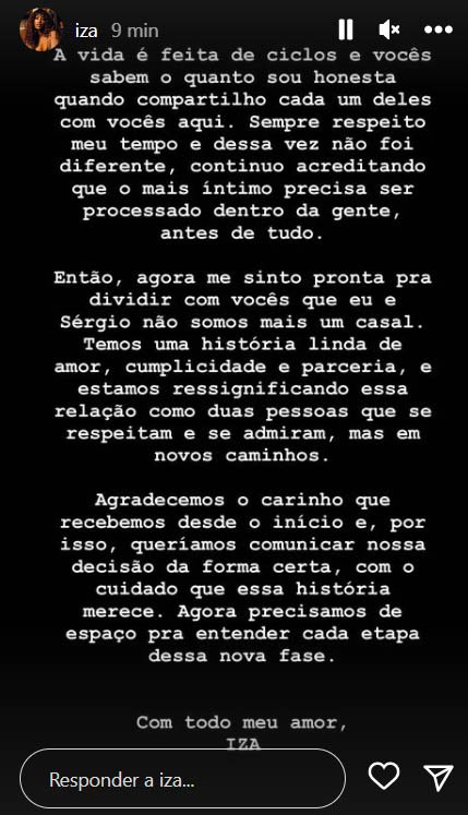“A vida é feita de ciclos e vocês sabem o quanto sou honesta quando compartilho cada um deles com vocês aqui. Sempre respeito meu tempo e dessa vez não foi diferente, continuo acreditando que o mais íntimo precisa ser processado dentro da gente, antes de tudo. Então, agora me sinto pronta para dividir com vocês que eu e Sérgio não somos mais um casal”, disse ela. E completou: "Temos uma história linda de amor, cumpliciade e parceria, e estamos ressignificando essa relação como duas pessoas que se respeitam e se admiram, mas em novos caminhos. Agradecemos o carinho que recebemos desde o início e, por isso, queríamos comunicar nossa decisão da forma certa, com o cuidado que essa história merece. Agora precisamos de espaço para entender cada etapa dessa nova fase. Com todo meu amor, Iza”.