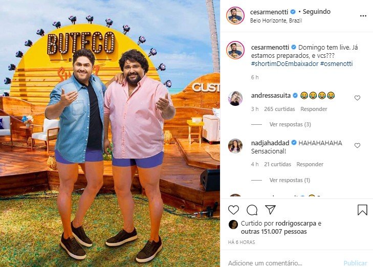 César Menotti e Fabiano divertiu a web ao compartilhar um meme vestindo o shortinho de Gusttavo Lima que ele usou durante sua última live no domingo (2). Os sertanejos compartilharam uma montagem vestindo o mesmo look para divulgar a sua própria live, que acontece no próximo domingo (9).