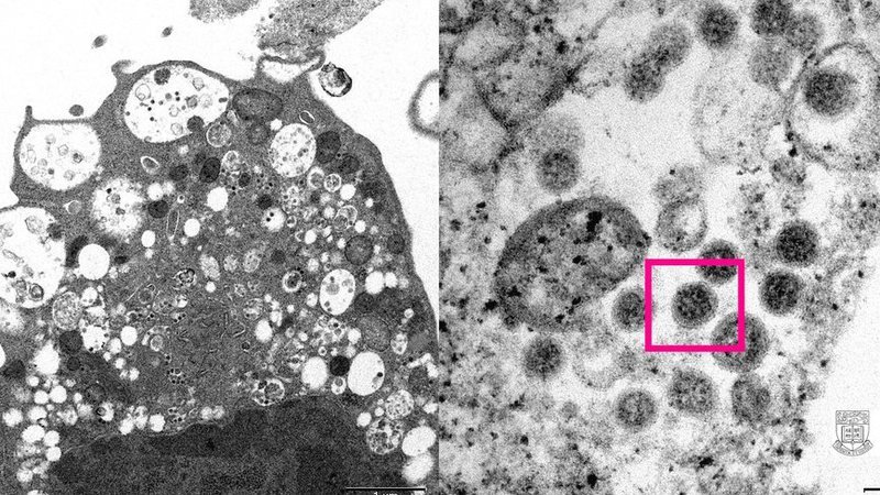 Na imagem à direita, a célula está infectada. Na parte que tem uma caixa vermelha, há partículas virais com pontas em forma de coroa.
