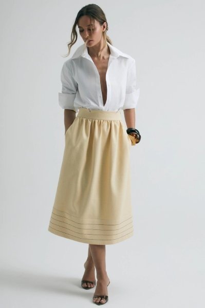 A principal aposta para valorizar o “Cloud Dancer” é o visual monocromático. O tom pode surgir em tecidos fluidos, alfaiataria leve e peças minimalistas, criando um efeito sofisticado e moderno. Ideal para ocasiões diurnas, eventos ao ar livre e até propostas urbanas com um toque chic.