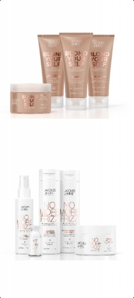 A Jaques Janine está lançando ainda as linhas Perfect Curls, para cabelos cacheados, crespos e ondulados; Ultra Blond, para fios loiros naturais, descoloridos ou grisalhos; Luminous Glow, para cabelos opacos e sem vida; Reconstrução Total, para madeixas quebradiças e com pontas duplas; After Colors, para cabelos coloridos; Oil Control, para cabelos oleosos; Liso Absoluto, para cabelos volumosos e indisciplinados; Hidratação Profunda, para fios secos; Mega Volume, para cabelos finos e sem volume e Power Nutrition, para cabelos ressecados, porosos ou opacos.