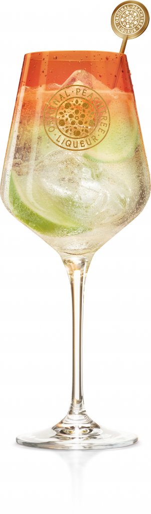 Em uma taça grande adicione gelo, Peachtree, suco de limão, água com gás e misture bem