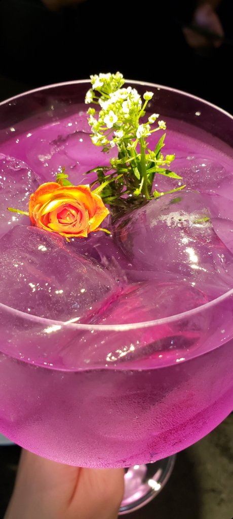 Em uma taça de gin, inclua o gin infusionado com gelo e a flor Clítorea Ternatea. Adicione água tônica para mudança de cor.