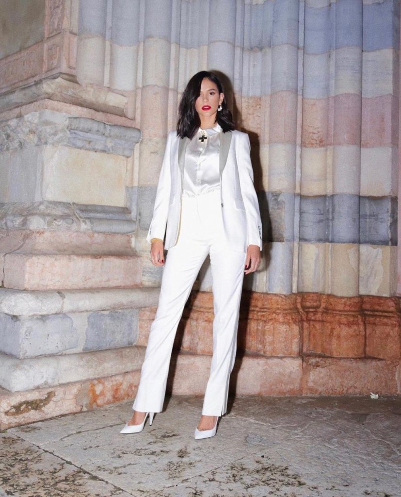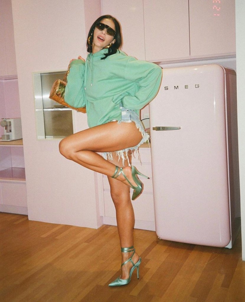 Em um estilo bem anos 80, Bruna adiciona o neon —em alta nos últimos tempos — junto à uma jaqueta de couro com detalhes em vermelho. Os tênis com meia completam a proposta vintage e moderna ao mesmo tempo.