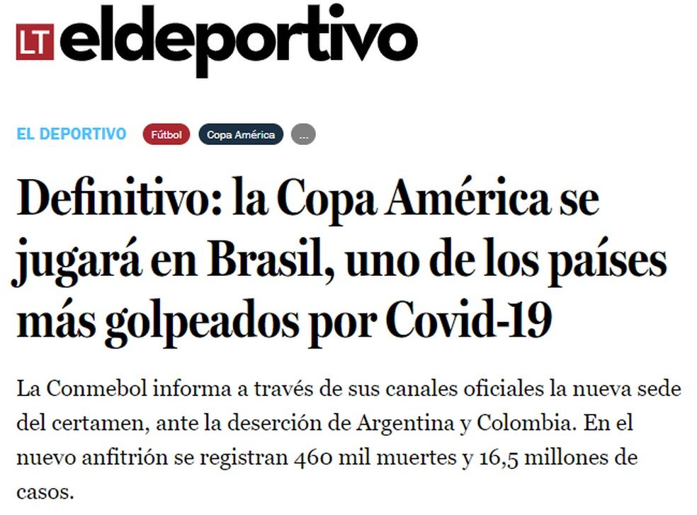 A Conmebol anunciou nesta segunda-feira (31), que o Brasil será o país-sede da Copa América 2021. Contudo, após o anúncio, os principais jornais da América do Sul e do mundo repercutiram o fato de o Brasil ainda ter altos números da Covid-19, doença causada pelo novo coronavírus. Anteriormente, a competição aconteceria somente na Argentina. Mas a realização do evento foi descartada no país devido a intensificação da pandemia.