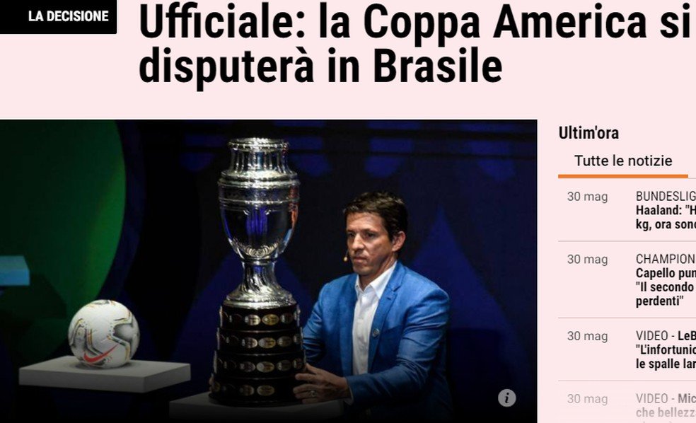 O portal italiano noticiou a alteração e no texto, deu ênfase ao fato de o Brasil não ter situação melhor que a da Argentina em relação a covid. “A Conmebol, portanto, agiu em situação de emergência para encontrar uma nova casa para a edição de 2021 e no final a escolha recaiu sobre o Brasil. Um país em que, no entanto, as condições associadas à pandemia certamente não são melhores”, escreveu o jornal italiano.