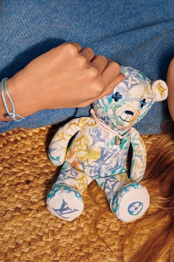 O cadeado do acessório é feito de prata reciclada, enquanto a pulseira é de algodão orgânico. Além disso, há também o ‘Doudou Louis’ , um ursinho também em algodão orgânico e estampado com o monograma da LV em estilo tie-dye.