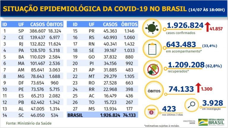 Em relação ao número de casos, a pasta apontou 41.857 diagnósticos positivos, o que elevou para 1.926.824 o total de casos confirmados da doença no Brasil. Na segunda (13), foram registrados 733 mortes e 20.286 novos casos.