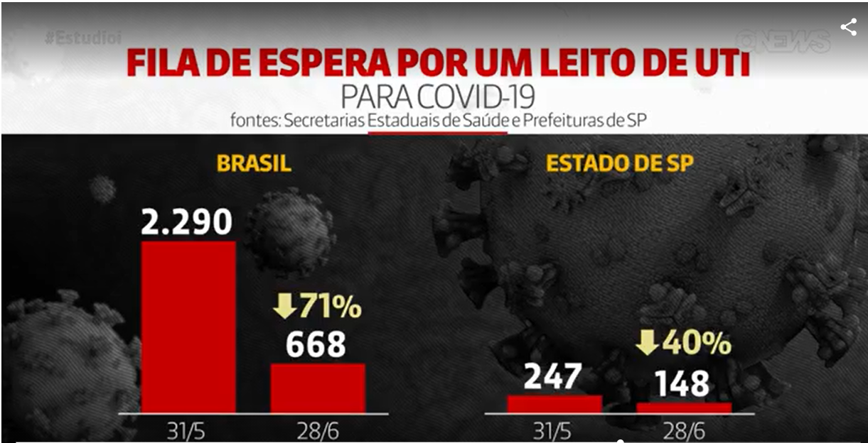 Um levantamento exclusivo realizado pela GloboNews aponta que a fila de espera por um leito de Unidade de Terapia Intensiva (UTI) para tratamento contra a Covid-19, doença causada pelo novo coronavírus, diminuiu 71% em um mês no Brasil. Um jornalista da emissora disse nesta terça-feira (29), durante o jornal ao vivo, que o resultado é um reflexo da vacinação da população contra a covid.