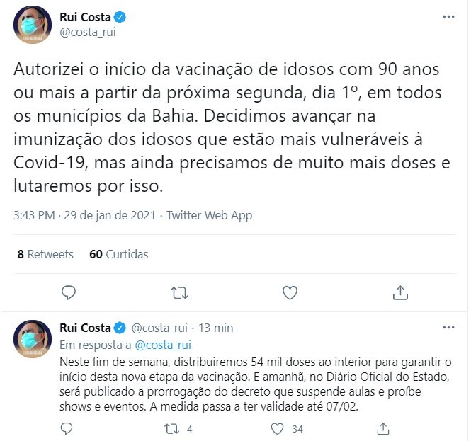 A Bahia possui um total de 284.321 vacinas, que já foram aplicadas em 154.720 pessoas. Em uma rede social, Rui reconheceu que o estado ainda precisa de mais doses para a etapa e completou dizendo que "lutaremos por isso".