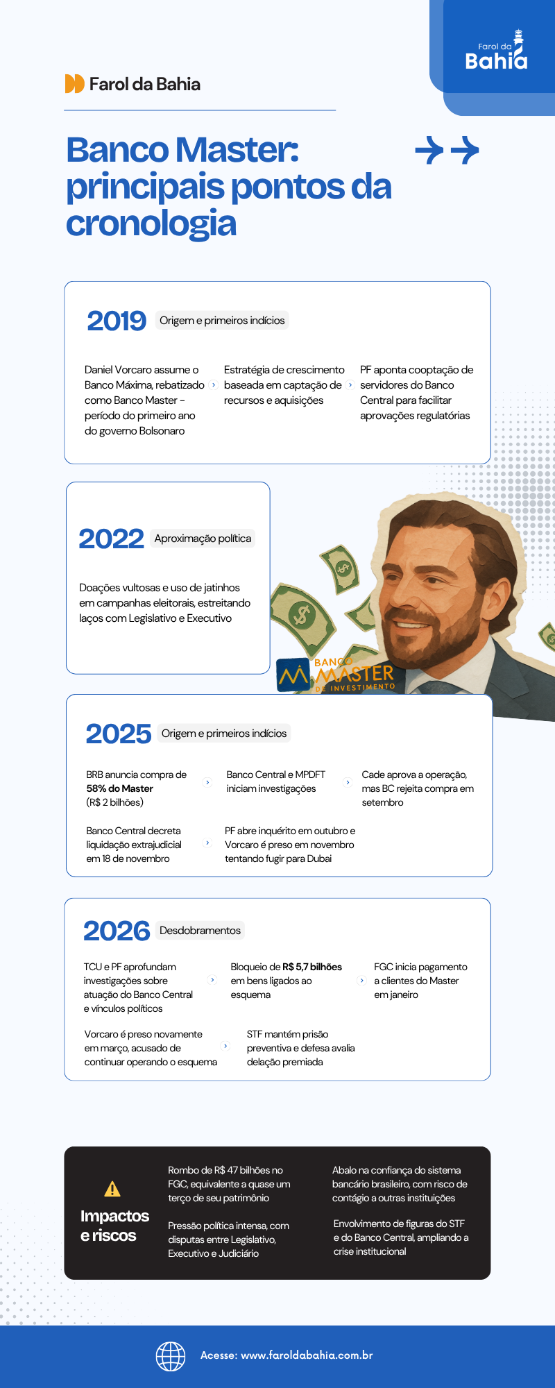 • 5 de abril: O Banco Central realiza reunião com grandes bancos para discutir soluções para ativos de maior risco do Master. A expectativa envolve o uso do Fundo Garantidor de Créditos (FGC)