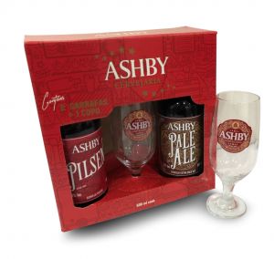 O kit vem com duas garrafas de cerveja além de um copo exclusivo da Ashby.