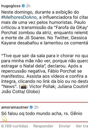 Amora Mautner saiu em defesa de Fabio Porchar na treta com Gkay. Em um comentário o Instagram de Hugo Gloss, que noticiou a polêmica, a diretora de "Verdades secretas 2" chamou o humorista de "gênio" ao fazer a piada com a influenciadora paraibana e afirmou que Porchat "só falou o que todo mundo já sabe".