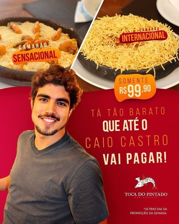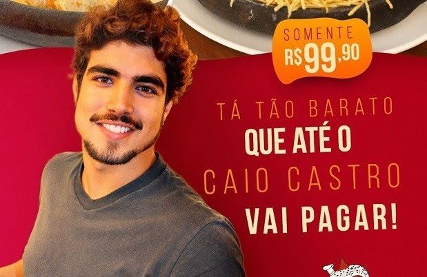 Um dos assuntos que viralizou na web na última semana foi a posição do ator Caio Castro sobre pagar a conta do restaurante em um encontro amoroso durante entrevista ao podcast 'Sua Brother'. O próprio ator foi às redes sociais explicar a sua fala, e ainda aproveitou a repercussão para anunciar uma campanha filantrópica e fazer uma publicidade de um aplicativo de descontos em alimentação. Diversos restaurantes resolveram surfar na onda da fala do ator e fazer promoções com sua imagem. Resumo da história: Todas as marcas e empresas que, indevidamente, usaram a imagem do ator e piloto Caio Castro serão notificadas pelo departamento jurídico do artista, e as indenizações serão destinadas para doação de cestas básicas às famílias carentes".