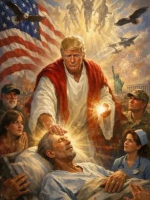Na imagem é possível ver Trump vestido com um traje religioso e com a mão na cabeça de um homem, que parece que está doente. Um militar, uma enfermeira e outros personagens aparecem observando o momento. Ao fundo, símbolos relacionados ao país, como a bandeira e a Estátua da Liberdade, complementam a composição.