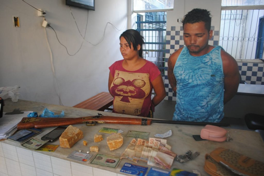 Uma dupla foi presa com drogas na tarde desta quinta-feira (10), na rua Providência, bairro de Várzea Alegre, em Itamaraju, no sul da Bahia. Adicleia da Silva Chaves, 24 anos, e Valdinei Jesus dos Santos, 29, foram apreendidos com uma espingarda de fabricação artesanal, 494 gramas de crack e R$ 261, além de dois celulares e dois cartões de crédito.